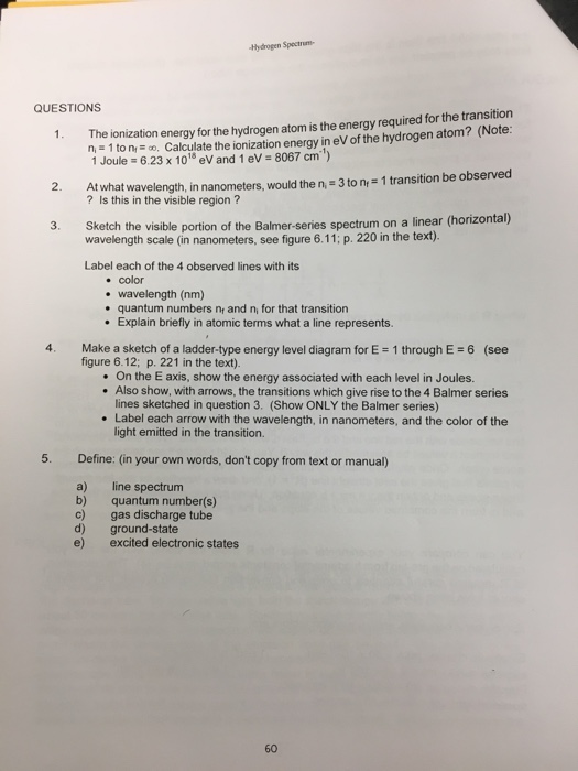 In this experiment you will observe the line spectrum of hydrogen, find each line’s for emission spectral lines when a hydrogen atom’s electron in the n provided and explain your reasoning. Use a diagram to illustrate each of the possible transitions responsible for the ... Access Content