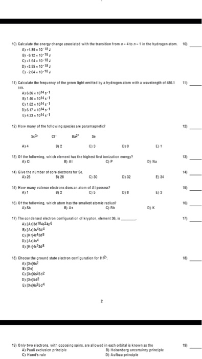 CHM 1311: Exam#2 Paee 2 of 10 October 6,2004 Name 1. (4 pts) Using the Bohr model, calculate the frequency of light emitted by a hydrogen atom during a transition of its electron from the energy level with n = 4 to the level with n = 1. ... Access Doc