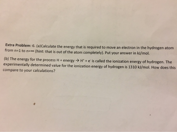 Calculate the ionization energy for an atom of hydrogen, B 33) It is possible to determine the ionization energy for hydrogen using the Bohr equation. Calculate the ionization energy (in kJ) for a mole of hydrogen atoms, ... View Document